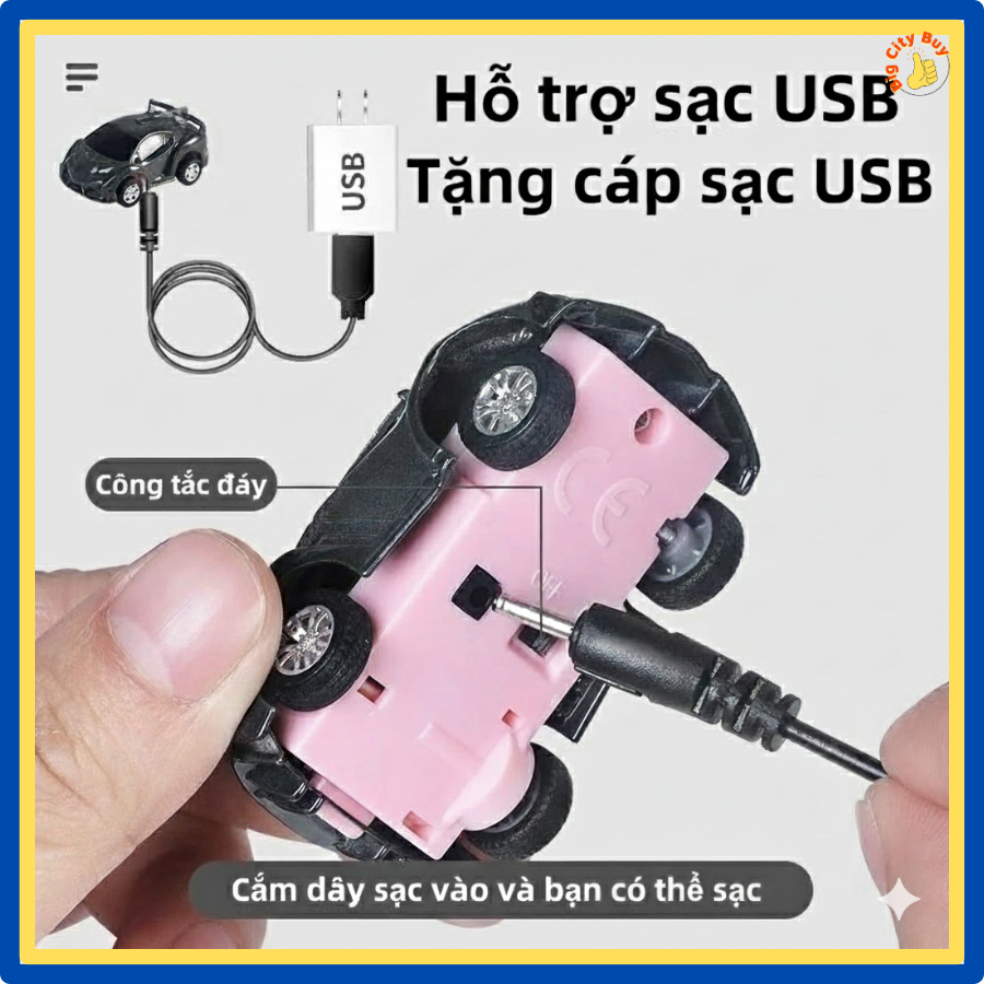 • Cách sử dụng: Bật công tắc dưới xe → đặt xe vào đồng hồ → nhấn nút tiến hoặc xoay để điều khiển; sạc xe qua cáp USB đi kèm.
